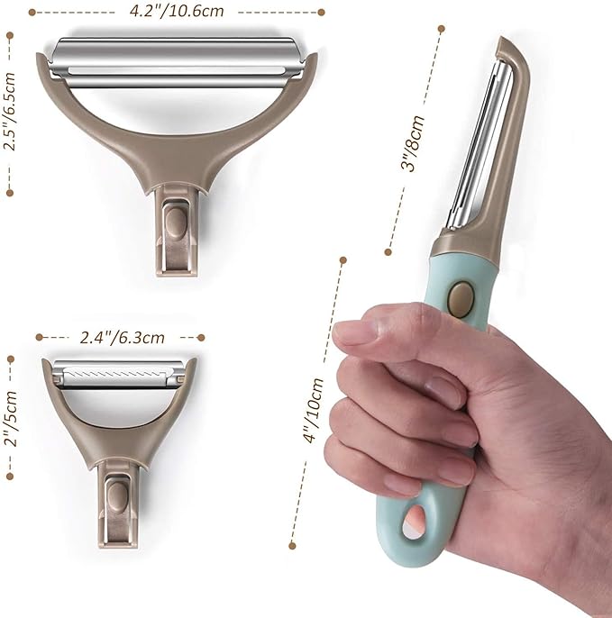 • CONTAIN â?? 1Pc Set New design and updated peeler set have 3 replaceable stainless steel blades that fits one handle. Easy to store and save space<br>